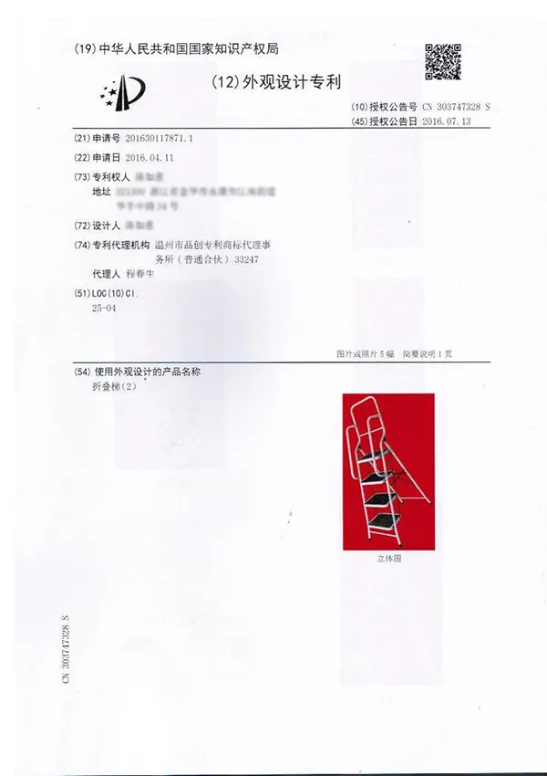 • Patent Certificate for Folding Ladder